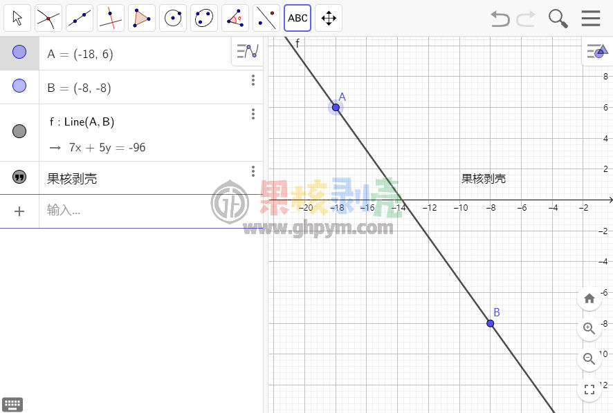 另一方面来说,您也可以直接输入方程和点坐标。所以,GeoGebra 也有处理变数的能力(这些变数可以是一个数字、角度、向量或点坐标),它也可以对函数作微分与积分,找出方程的根或计算函数的极大极小值。