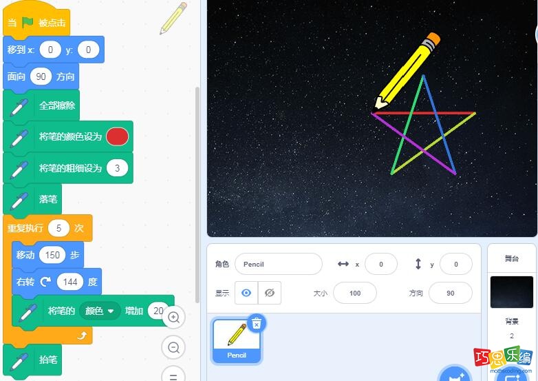步骤一、添加角色“Pencil”,选择背景stars;编辑角色”Pencil”造型,将笔尖设为中心点,这样的话,就是用笔尖去画了;Pencil的初始坐标位置是(0,0),面向90°;