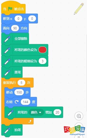步骤三、落笔开始绘制,移动150,右转144°,每次颜色增加20;重复循环5次即可;
