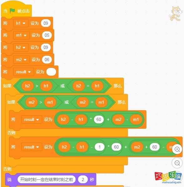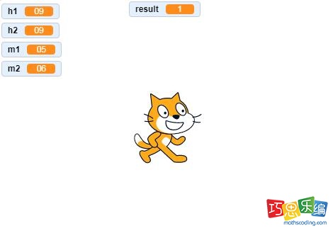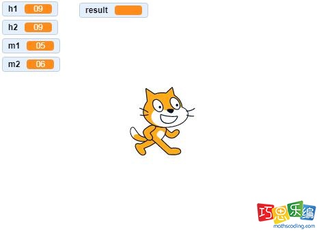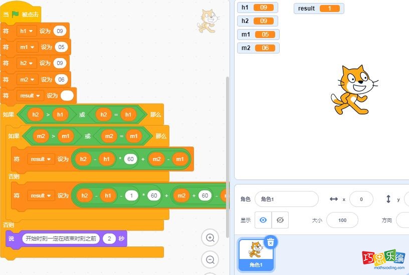 默认小猫角色和白色背景,小明在为自己规划学习时间。现在他想知道两个时刻之间有多少分钟。你能通过编程帮他做到吗?