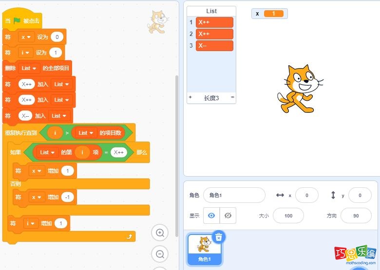 步骤二、遍历列表中的没项目数据,判断,如果等于X++,则将变量X加1,否则X减1,因为列表中的数据只有X++和X–,所以用如果那么…否则就可以。如果要做的更加严谨,就用条件单支判断;