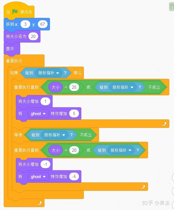点击绿旗之后,首先初始化了按钮的位置和大小,大小设置为按钮本身的20%。在侦测模块中有一个碰到鼠标指针?的语句,它可以用来判断角色是否正在触碰鼠标指针,通俗的讲就是判断是否鼠标悬停在角色上,于是我们将这条侦测语句放在如果那么语句的条件部分,如果判断为真,就重复执行将按钮的大小每次增加1,并且将虚像的特效增加5,虚像特效可以使按钮变成半透明的。
