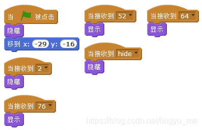 当新建好消息(以scratch音符编码表中每个音符编码为消息名各新建一个消息,再增设三个消息66、68与hide)后,我们要让“显示”角色们具备执行能力。