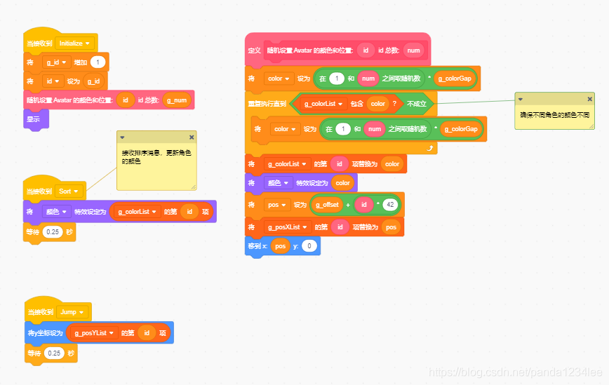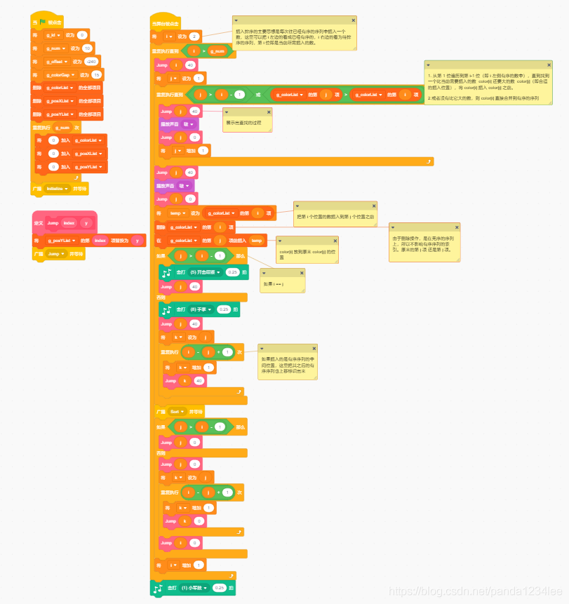 随机初始化小猫的颜色,然后点击 “空格” 对颜色进行插入排序,我这里设置的颜色规则是 红>蓝>绿>黄。其中进行比较的两只小猫会跳起(待插入的小猫会保持跳起状态一段时间),被调整的序列也会跳起,这样可以更直观的看出是哪两只小猫在进行比较(同时还搭配了不同的音效),以及具体插入的位置在哪里。