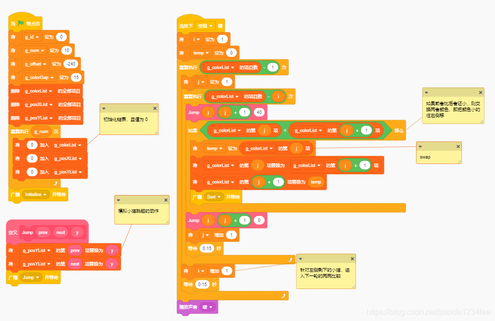 冒泡排序的代码在舞台代码块中,每次比较都会让小猫跃起,每完成一次交换都会发送 “Sort” 消息更新角色的颜色,交换完之后再让小猫落下。